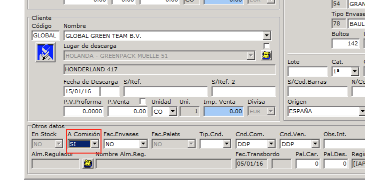 Las cargas a comisión son aquellas en las que no somos propietarios de la mercancía, sino que realizamos un trabajo de intermediación y se cobra un porcentaje al cliente o al proveedor. Las posiciones a comisión se marcan en la línea de la expedición como se indica en la imagen.