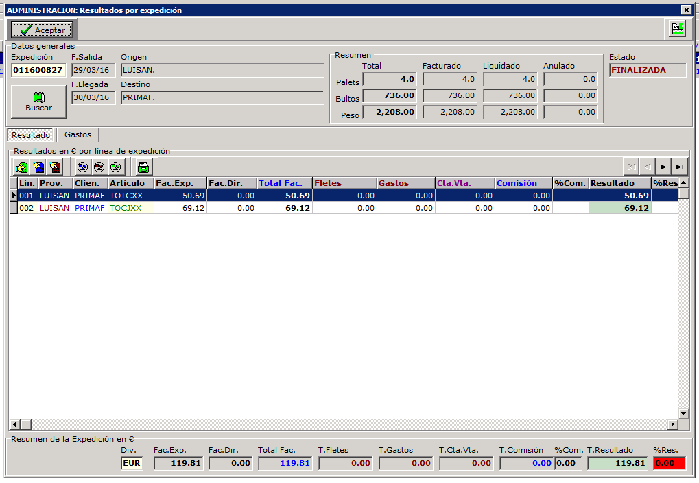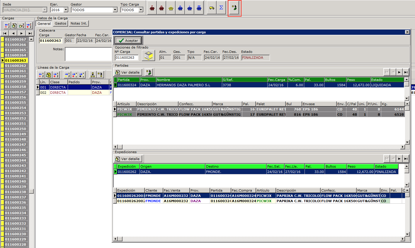 Además, en la pantalla de cargas, en la zona superior disponemos de una botón para mostrar las partidas y expediciones relacionadas con una carga.