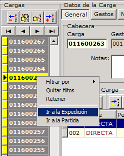 Las cargas que hagan sido finalizadas se convierten en expediciones, la numeración de las cargas y las expediciones no están vinculados, es decir son contadores diferentes. Podemos ir desde una carga a la expedición correspondiente usando el botón derecho en la lista de cargas.