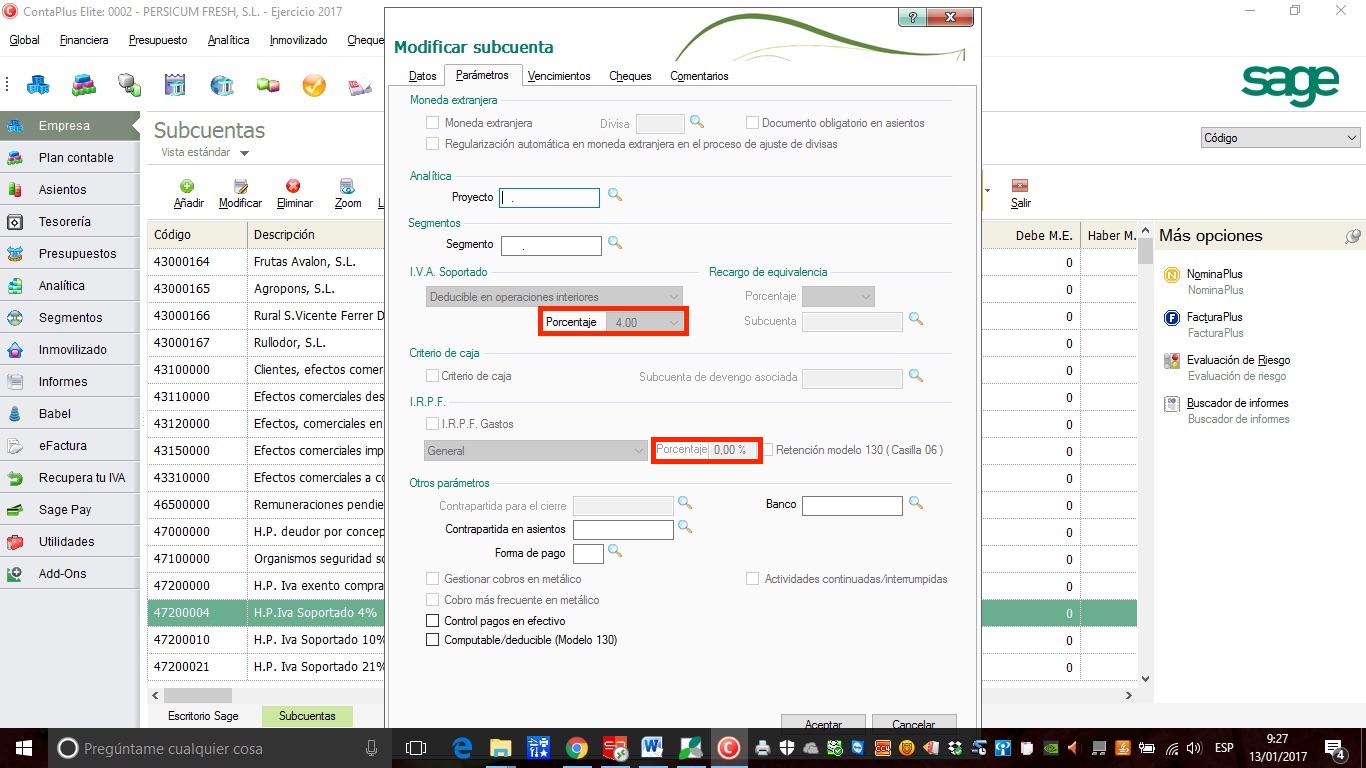 Si la cuenta ya está creada hay que borrarla y crearla de nuevo indicando el porcentaje en los campos correspodientes.