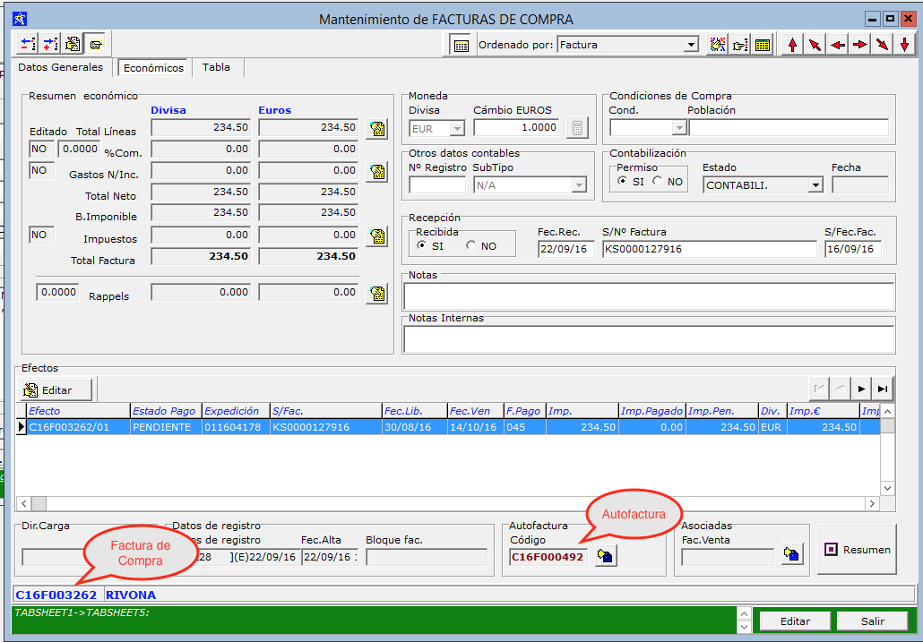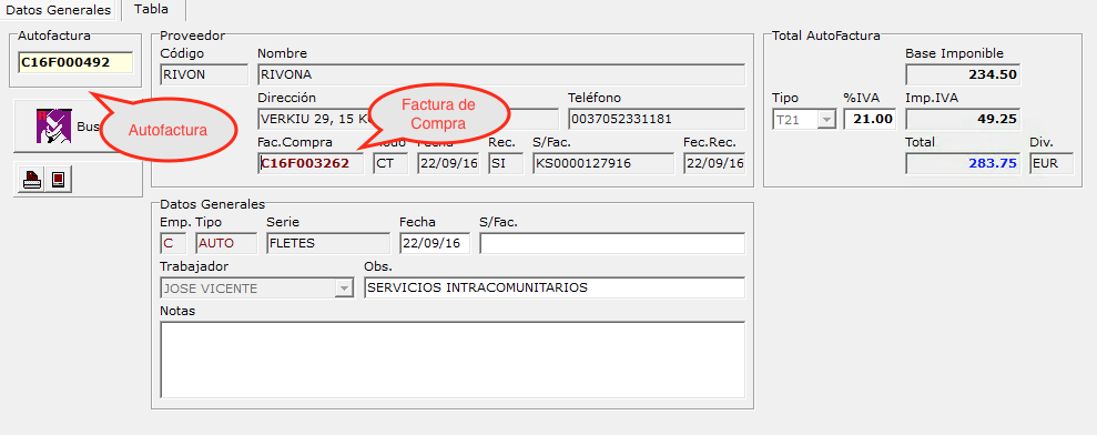Cada vez que se crea una factura de compra se genera de forma automática una autofactura y se enlace con ella, como se muestra en la siguiente imagen: