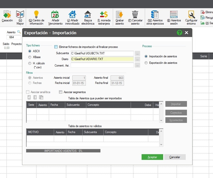 La importación se hace en dos pasos, primero se pulsa aceptar y los asientos se comprueban, si hay errores se muestra el tipo de error y no se activa el botón importar. Si no hay errores se permite pulsar sobre importar y se incorporan a la contabilidad todos los asientos que se muestran en la tabla superior.