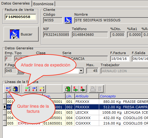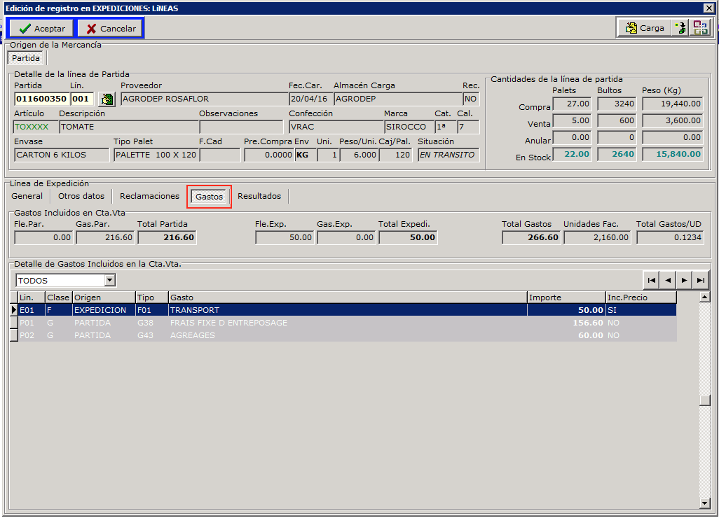 Para ver el detalle de los gastos de una expedición hay que entrar en la línea y acceder a la pestaña gastos.