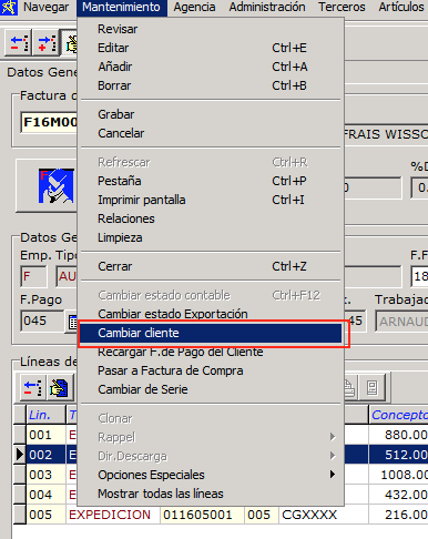 2.- En la factura de venta, opción Mantenimiento/Cambiar cliente.