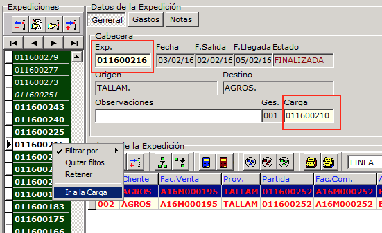 Para las expediciones directas que se crean desde las cargas, se registra su relación (en el ejemplo la expedición 011600216 procede de la carga 011600210). Las expediciones contra stock no disponen de esta relación.