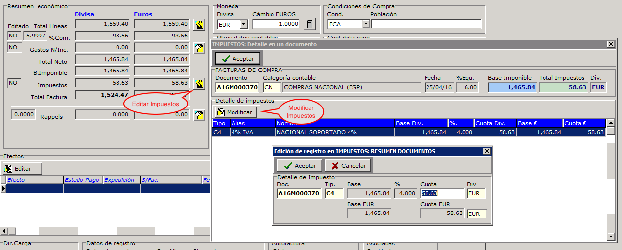 Excepcionalmente, en las facturas de compra se pueden modificar si el proveedor ha utilizado un redondeo no estándar al calcular el IVA y no coinciden las cuotas que presenta el proveedor en su factura con las cuotas calculadas por el programa.