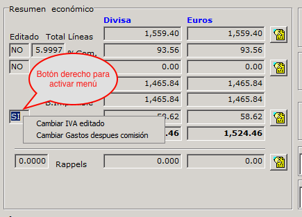 Se puede quitar el cálculo manual de impuestos situando el botón en la zona que se muestra , y con el botón derecho usando la opción Cambiar IVA editado.