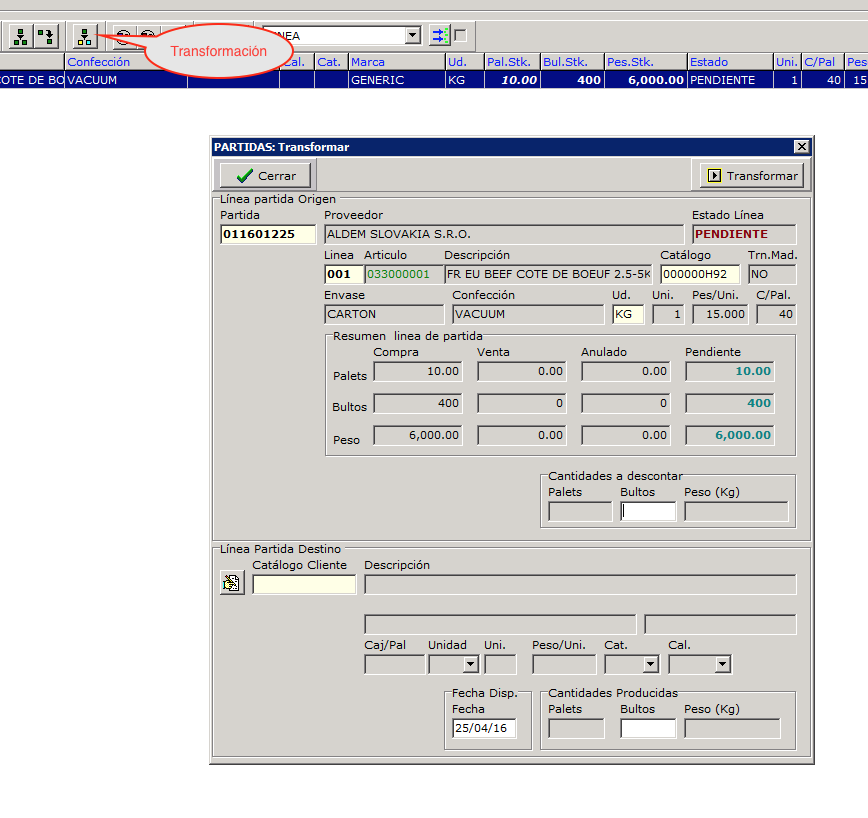 - 3.- Cada vez que el almacén informe de que ha procesado mercancía deberemos registrarlo usando el botón de transformación, en este botón se piden tres datos: Cantidades que se descontarán de la linea original, catálogo del producto que se creará y las cantidades que se han producido. El proceso comprueba que la familia e productos sea la misma y que la diferencia en peso no exceda del 30%.
