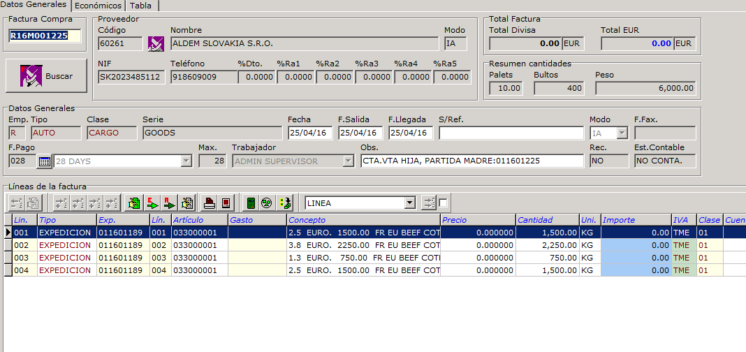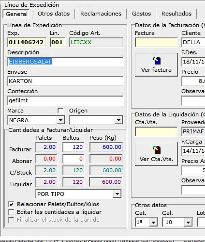 Antes de LIQUIDAR (LA R) hay que entrar en las LINEAS MADRE y poner el precio, el sistema repartirá a las líneas de partida hija y desde ahí a las expediciones.