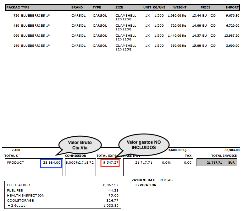 Observe que al descontar esos gastos estamos teniendo un incremento de los ingresos en la expedición pues pagamos menos importe por la cuenta de venta.