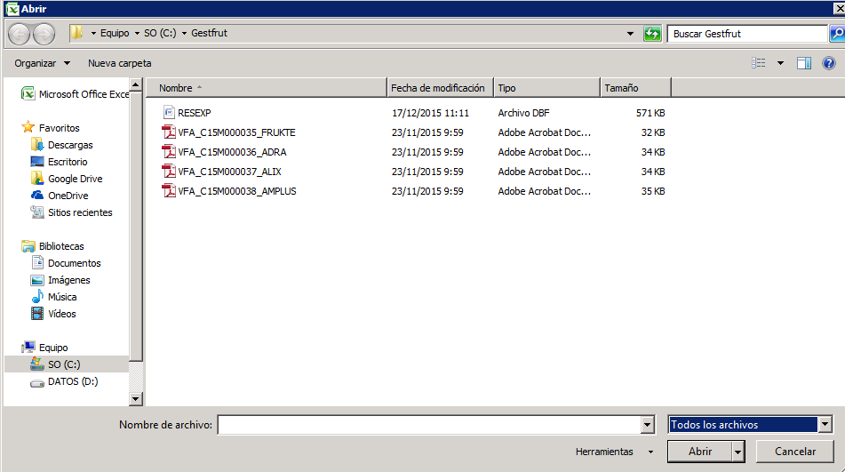 A continuación abres EXCEL , archivo abrir , buscas la carpeta local y seleccionas “TODOS LOS ARCHIVOS” , lo verás y lo cargas.