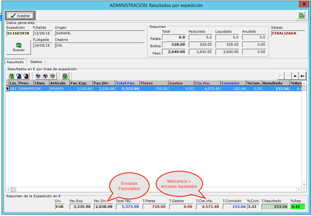 Cuando la expedición tiene envases retornables se facturan al cliente y se liquidan al proveedor por la misma cantidad e importe. En este caso, el resultado en EUR no se ve afectado, pero si el porcentaje de resultados.